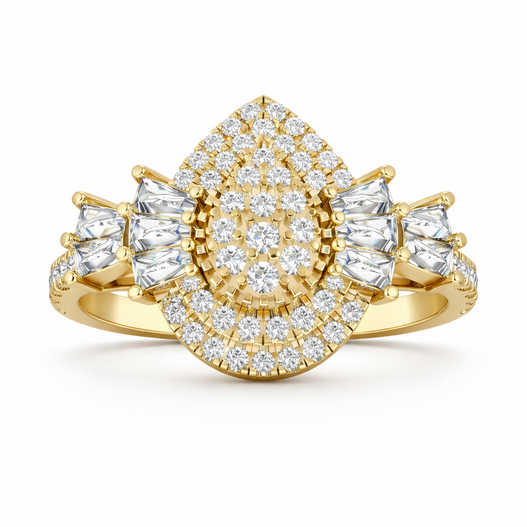 This bold and intricate ring features a pear-shaped cluster of sparkling stones, surrounded by a double halo of accent stones that add depth and brilliance to the design. The sides of the ring are adorned with unique baguette-cut stones, creating a striking contrast. Customizable upon request, this ring can be personalized with gemstones like sapphire, ruby, or emerald, allowing you to design a piece that is both distinctive and meaningful. Perfect for those who seek a show-stopping piece with a blend of elegance and glamour.