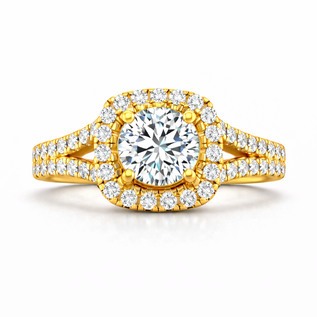 This exquisite ring features a round centre stone encircled by a halo of smaller stones, enhancing its brilliance and adding depth. The split band is adorned with additional stones, creating a balanced, luxurious design. Perfect for those who seek a blend of classic elegance and modern flair, this piece can be customized with gemstones like sapphire, ruby, or emerald for a personalized touch.