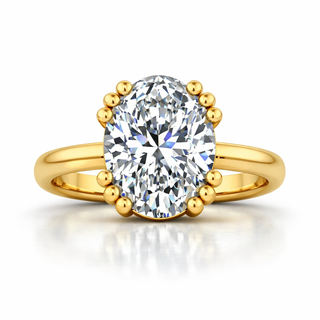 This stunning ring features a large oval centre stone held by an elegant, unique prong setting that enhances its brilliance. The minimalistic band allows the gemstone to take center stage, making it an ideal piece for those who appreciate classic elegance. Customizable with gemstones like sapphire, ruby, or emerald for a personalized touch.