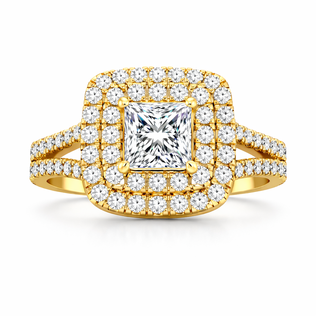 This stunning ring features a princess-cut centre stone, surrounded by a double halo of sparkling accent stones that create an enchanting and radiant look. The band is further enhanced with additional stones, adding to its brilliance and elegance. Customizable upon request, this design can be personalized with gemstones such as sapphire, ruby, or emerald, making it a truly unique piece. Perfect for those who appreciate a luxurious and eye-catching style.